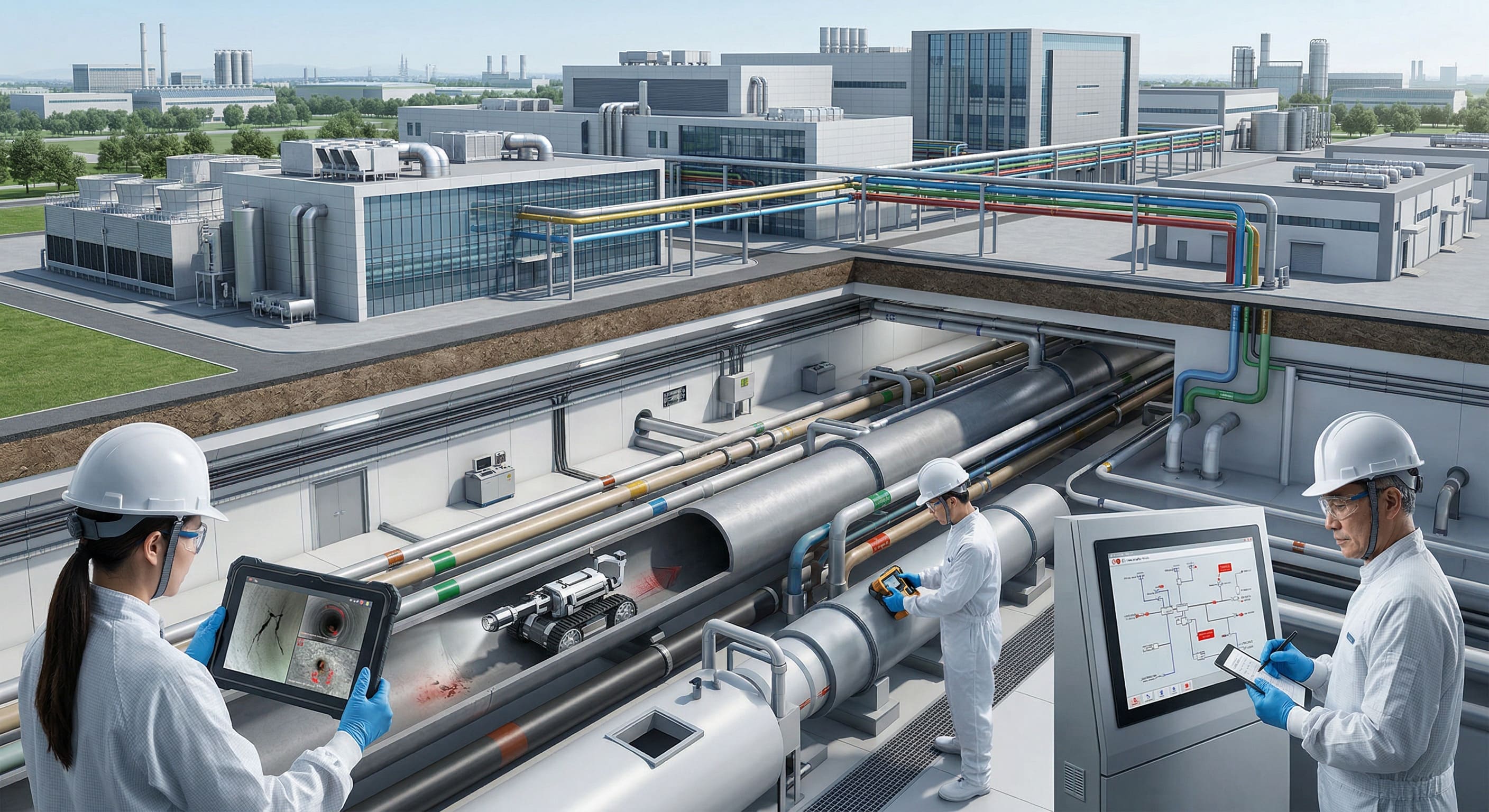 在精密製造與半導體產業中,「連續性產能」是維繫全球供應鏈穩定與企業獲利的絕對核心。現代化廠房內部佈滿錯綜複雜的地下與高架管線,負責輸送超純水、製程冷卻水,並排放高濃度化學廢液。這些隱蔽的地下管路一旦出現微小裂縫、沉陷或接頭脫落,往往引發難以挽回的連鎖反應:微量化學品洩漏不僅可能污染高等級無塵室,更可能觸發廠務系統的緊急停機機制。對以分秒計算產值的科技廠而言,任何非計畫性停機都意味著龐大的良率損失與交期延宕。