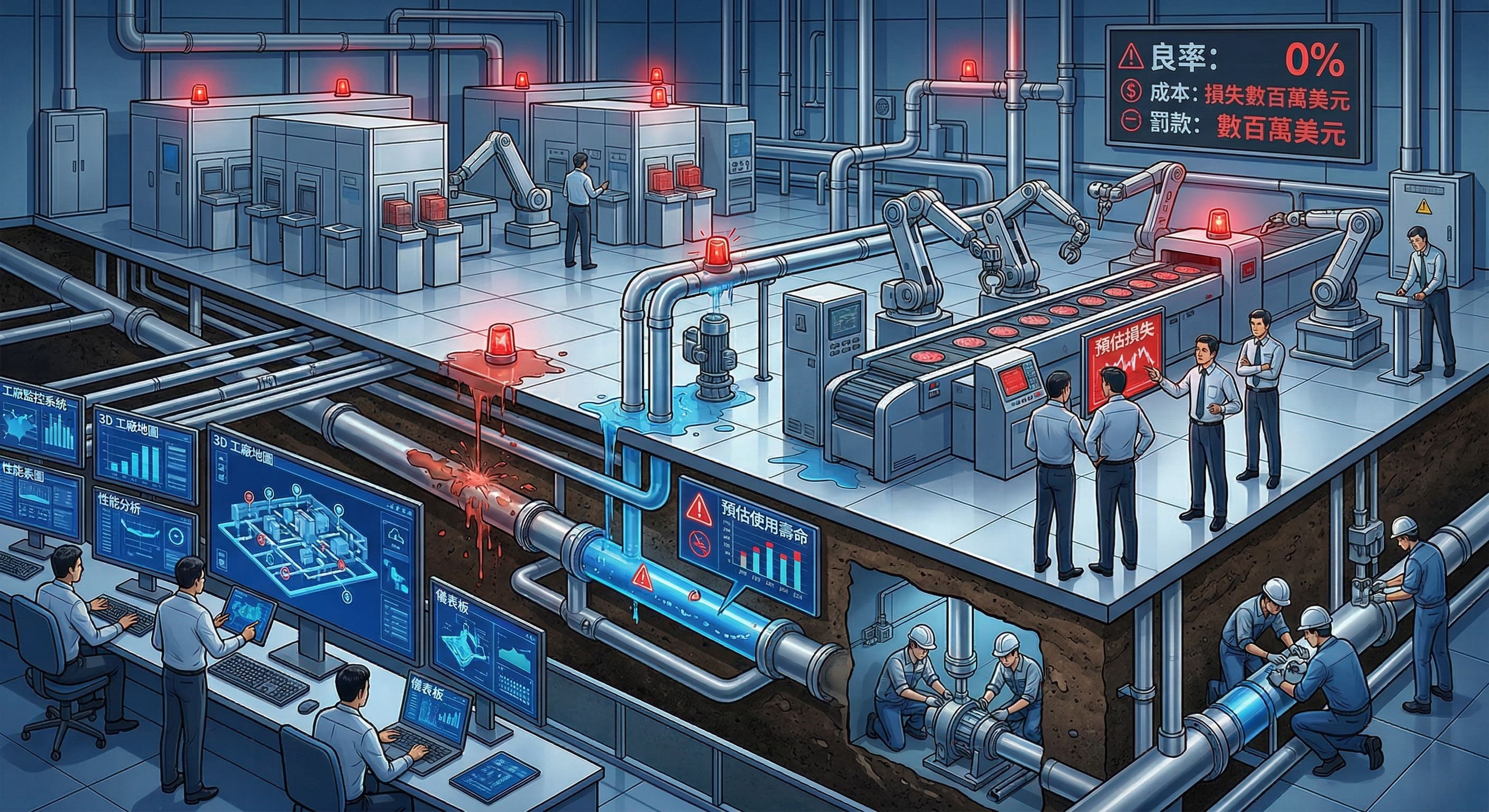 在全球競爭白熱化的工業 4.0 時代,大型製造業與科技廠房的運作分秒必爭。廠房地底下與高架層中,密佈著負責輸送超純水、製程冷卻水以及高濃度化學廢液的管網系統。這些隱蔽的工業大動脈一旦發生阻塞、洩漏或末端揚水泵浦故障,往往引發災難性的連鎖效應。輕則導致管線回堵、高風險廢液溢流污染無塵室,重則觸發全廠環安衛警報,迫使核心產線緊急停機。